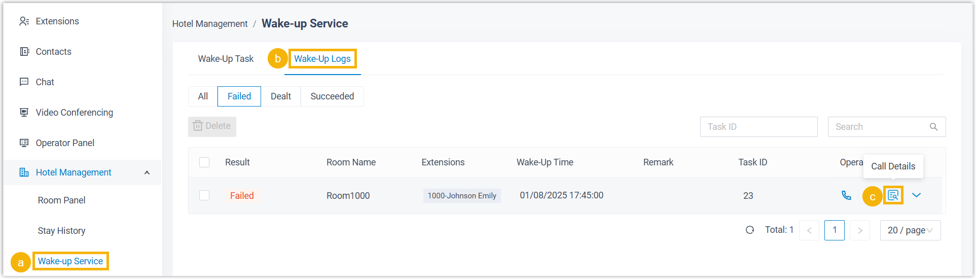 When it reaches the wake-up time, the PBX will make a call to the room phone(s). After the guest(s) answer the call, the system will play the specified voice prompt, then hang up the call.