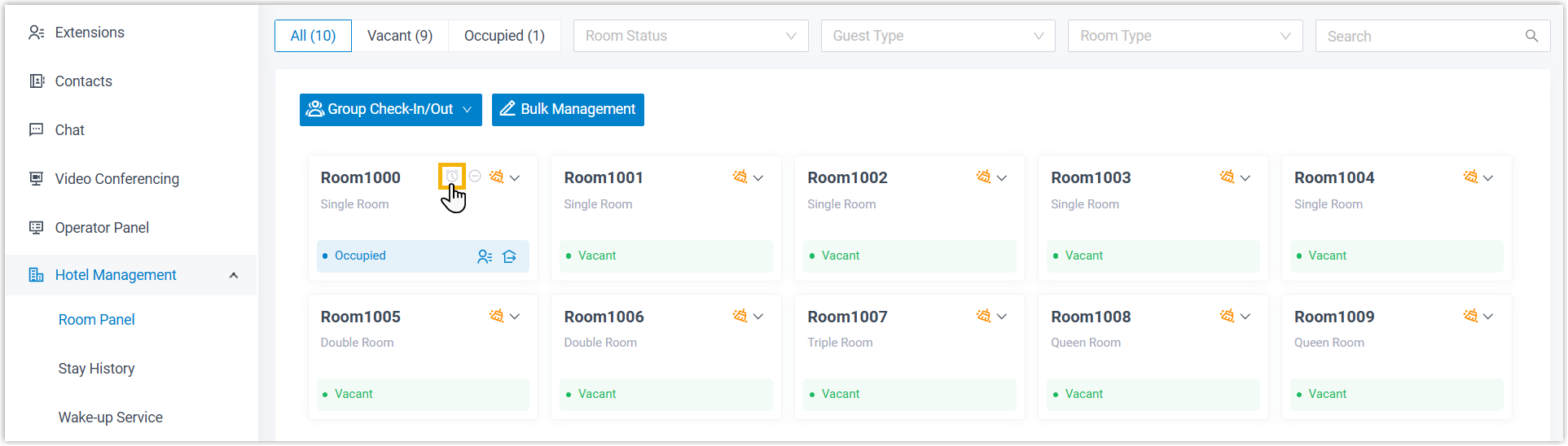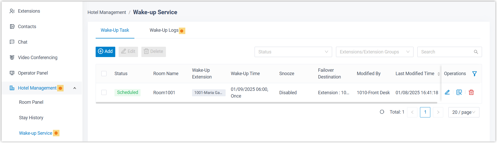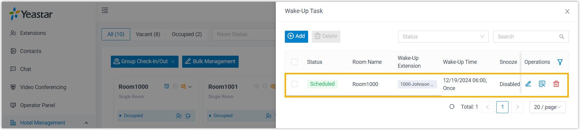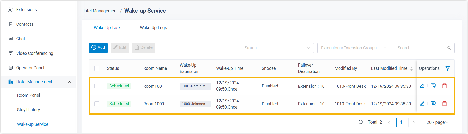 You can schedule wake-up tasks from the Wake-up Service panel, a dedicated panel for delivering wake-up call service, ideal for adding alarms for multiple guests at a time.