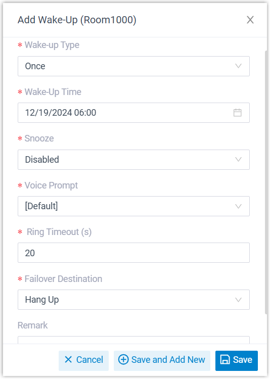 Wake-Up Time Select a wake-up time. Snooze Set the number of times to repeat the call if the guest(s) don't answer the wake-up call, as well as the interval between each repeat. Voice Prompt Select the voice prompt to be played when the guest(s) answer the wake-up call. Note: The available prompts are configured by hotel manager under custom prompts (Path: ).Ring Timeout (s) Set the time for the wake-up call to ring before it times out (Unit: Second). Valid value: 5 - 300