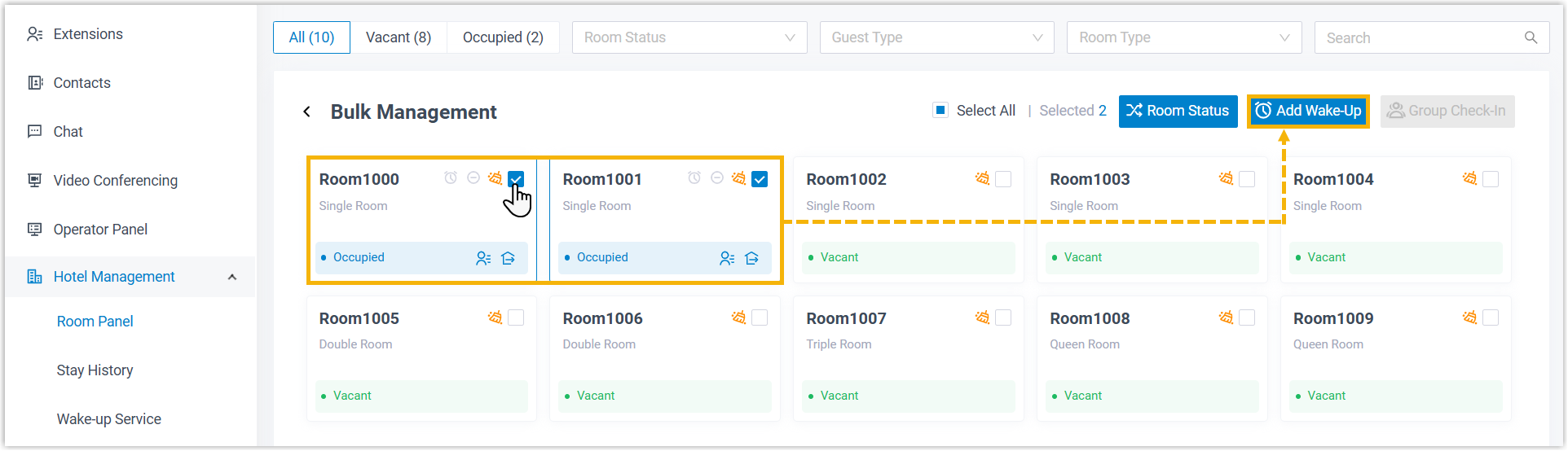 You can schedule wake-up tasks from the Room Panel, a room-based panel that visualizes all guest rooms, ideal for adding alarms for one or multiple guests.