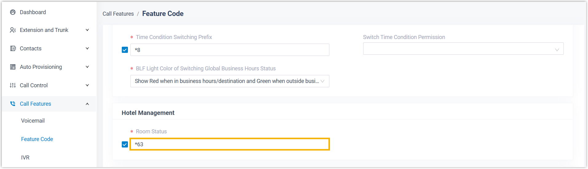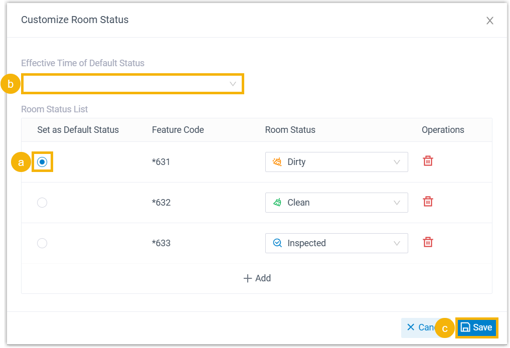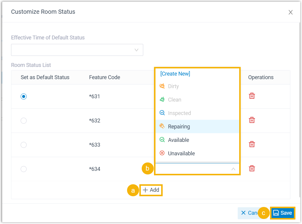 - Cloud Voice provides 6 built-in room status - Dirty, Clean, Inspected, Repairing, Available, and Unavailable, along with feature codes to facilitate housekeeping management. You can also customize desired room status as needed, as shown below.