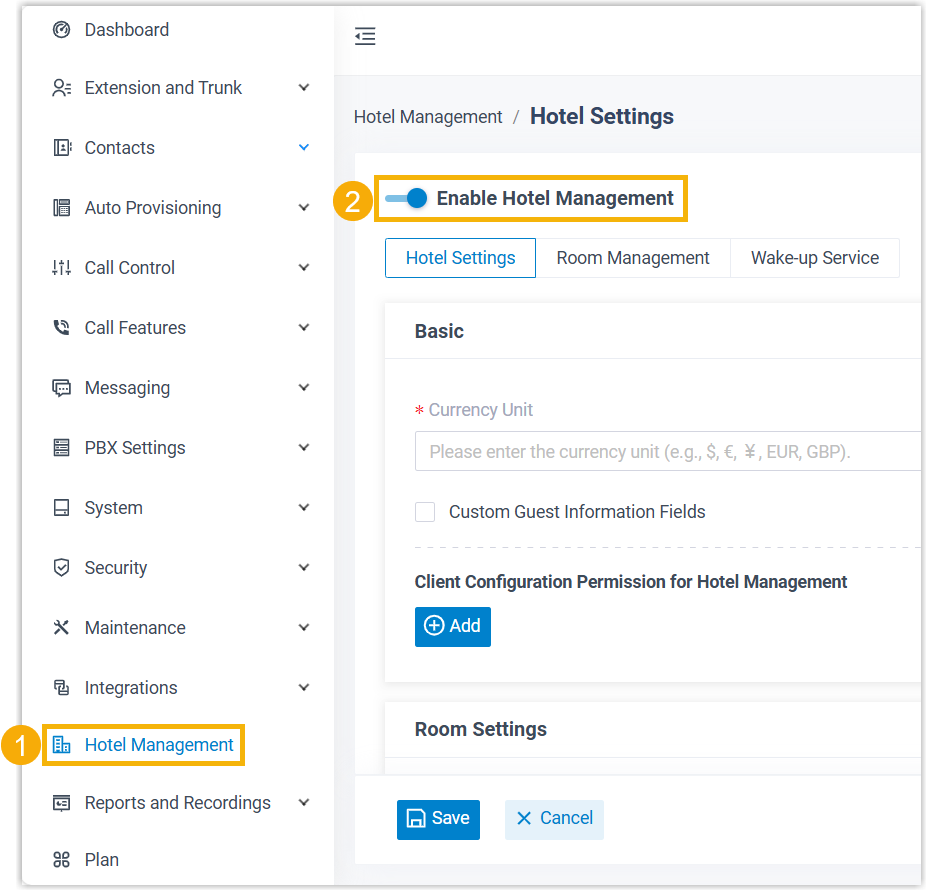 This topic describes how to enable and set up hotel service on Cloud Voice.