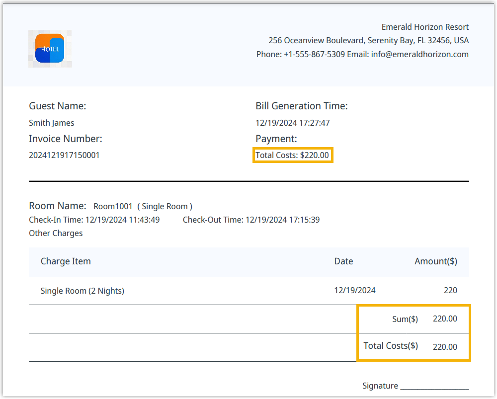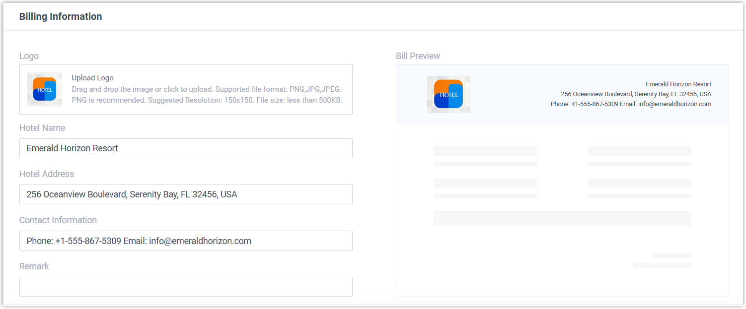 Go to Hotel Settings tab to configure currency preference, guest information fields, staff privilege for room operations, guest room policy, and hotel information.