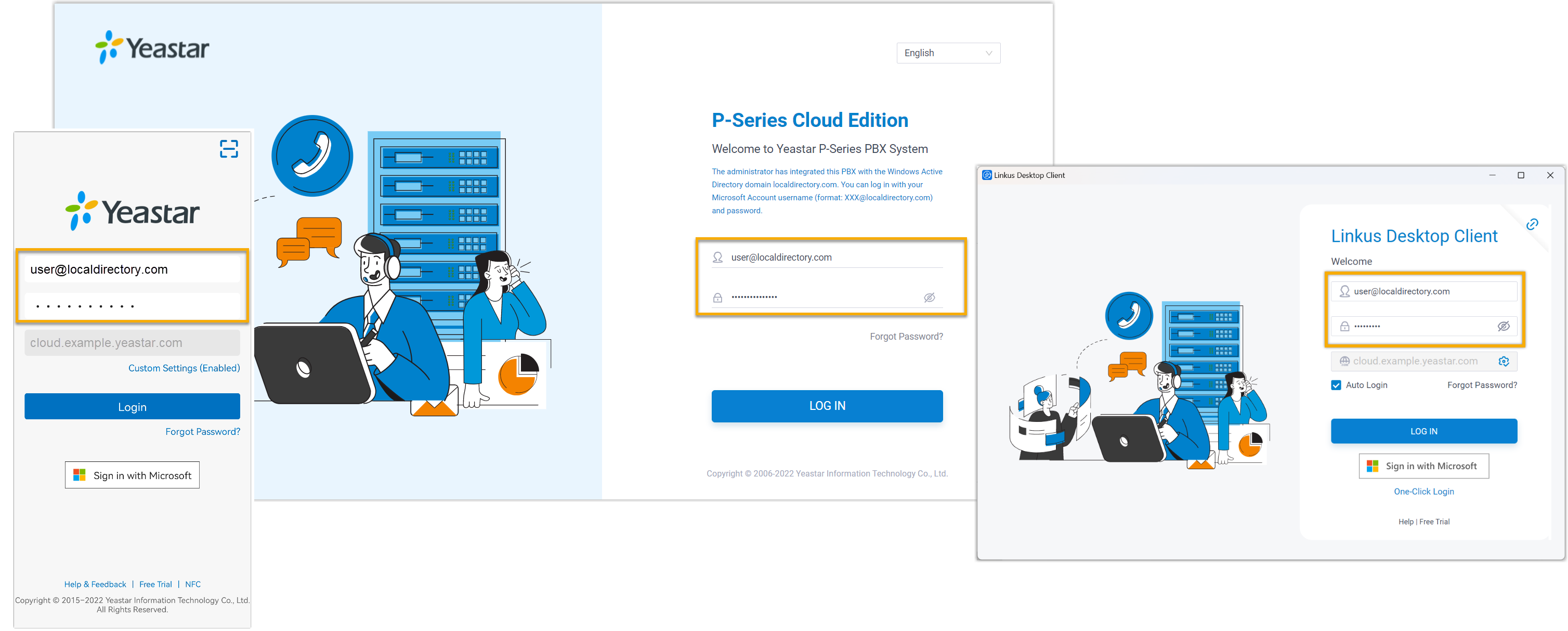 The synced AD users can directly enter the credentials of their AD domain accounts (Format: username@domainname) to log in to Cloud Voice App UC Clients.