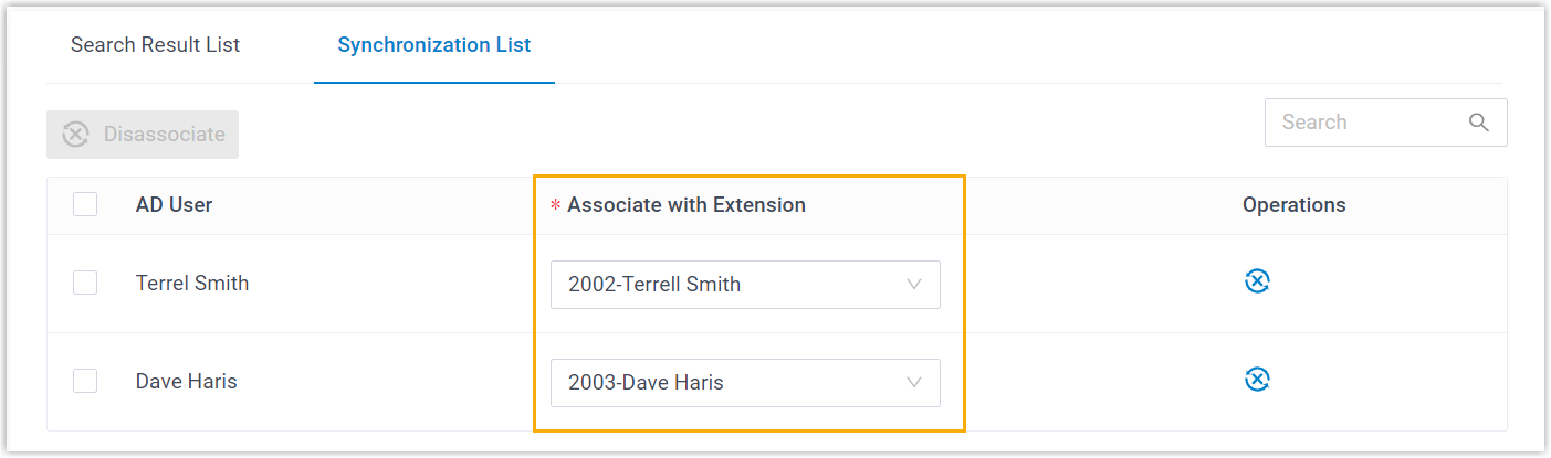 Tip: To disassociate a synced AD user with the PBX extension, select the desired AD user and click Disassociate button on the top of the list. After you save the setting, the AD user will be successfully disassociated with the extension. - In the Delete the Extension when its