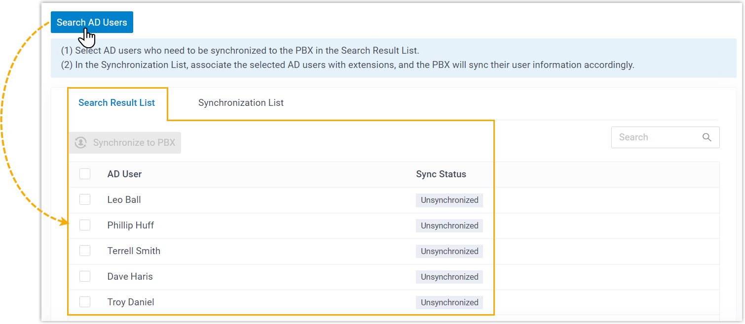 PBX searches AD users within the specified scope, and displays the AD users in the Search Result List.