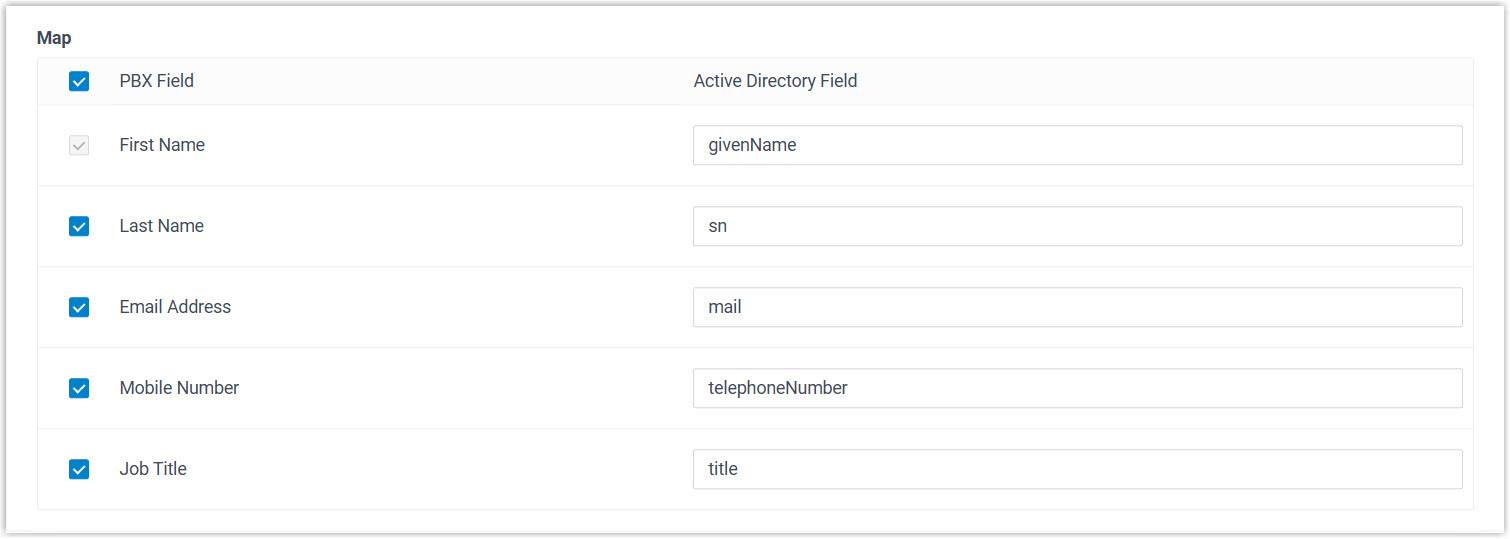 the fields for the user information you want to synchronize.Note: Refer to Active Directory User Object Property to fill in the Active Directory fields.
