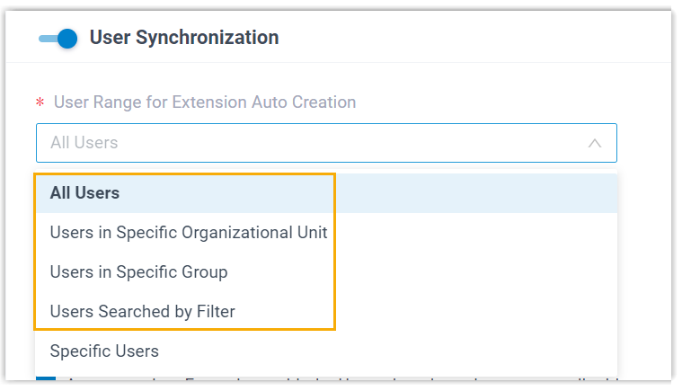 You can either bulk synchronize AD users within a specified range and automatically assign PBX extensions, or synchronize specific users and assign PBX extensions for them individually.