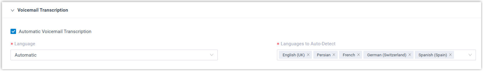 The system will automatically detect and transcribe voicemail messages in the selected languages.