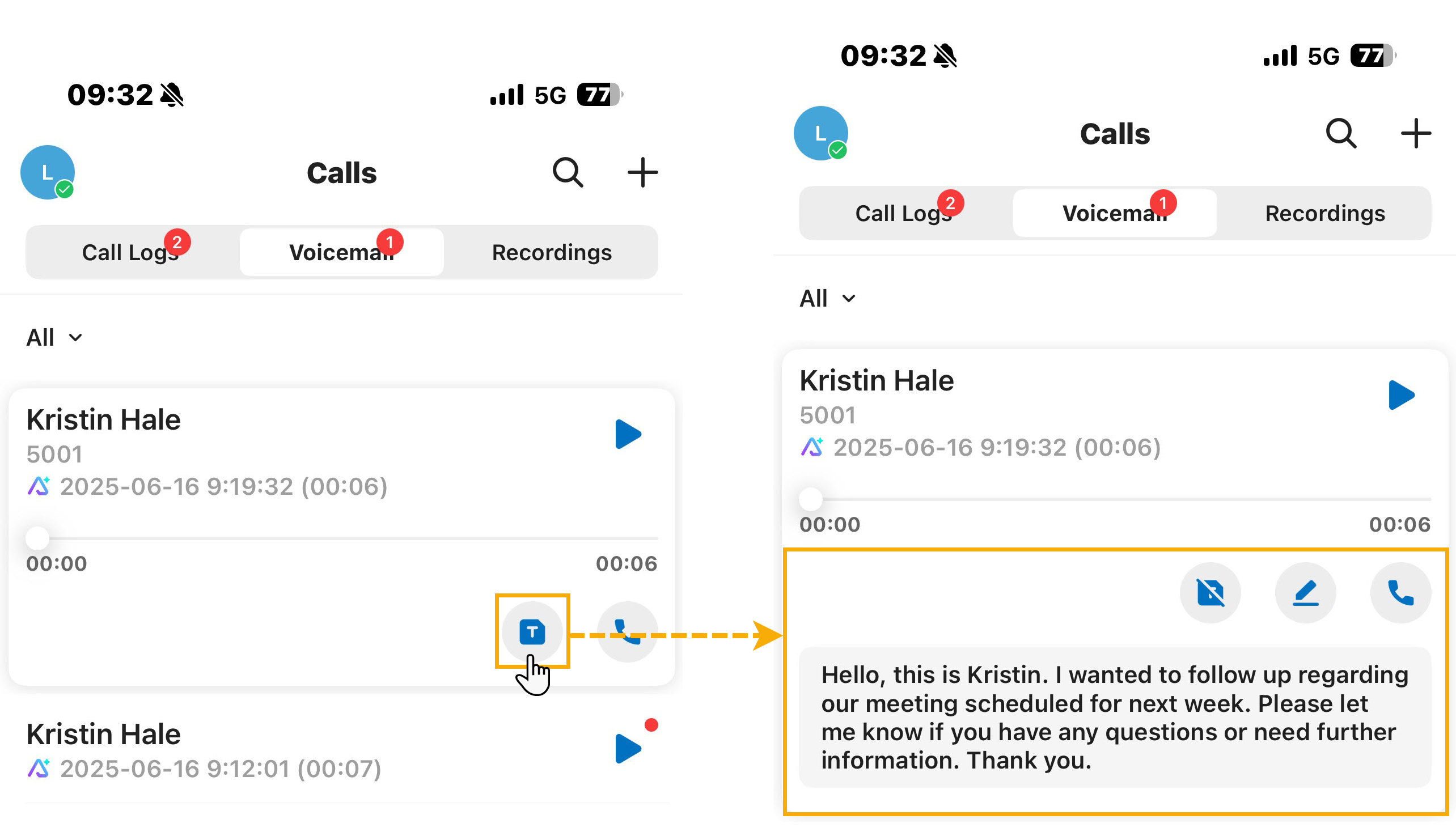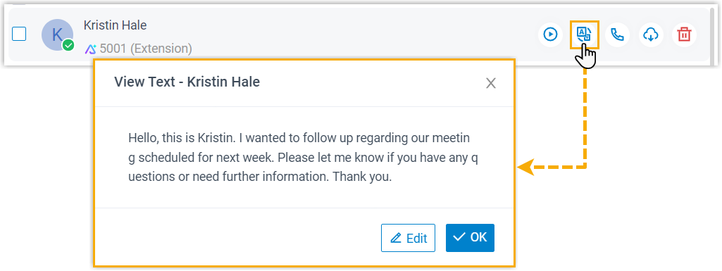 Users can view the transcribed text for each voicemail on their Cloud Voice App UC Clients (Path: Voicemails). The transcribed voicemail messages are marked with an icon .
