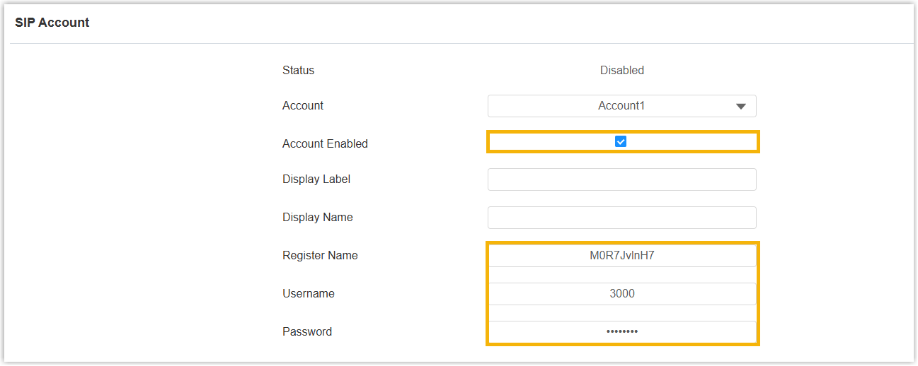 - Account Enabled: Select the checkbox to enable the SIP account.