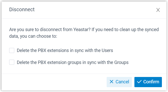 Option Description Delete the PBX extensions in sync with the Users - If selected, the extensions will be deleted.