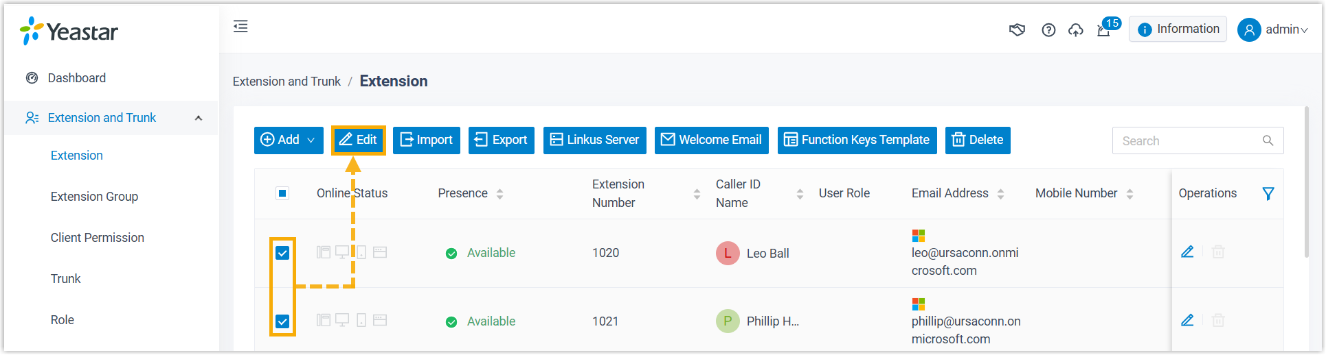 - Select the checkboxes of the synced users' extensions, then click
