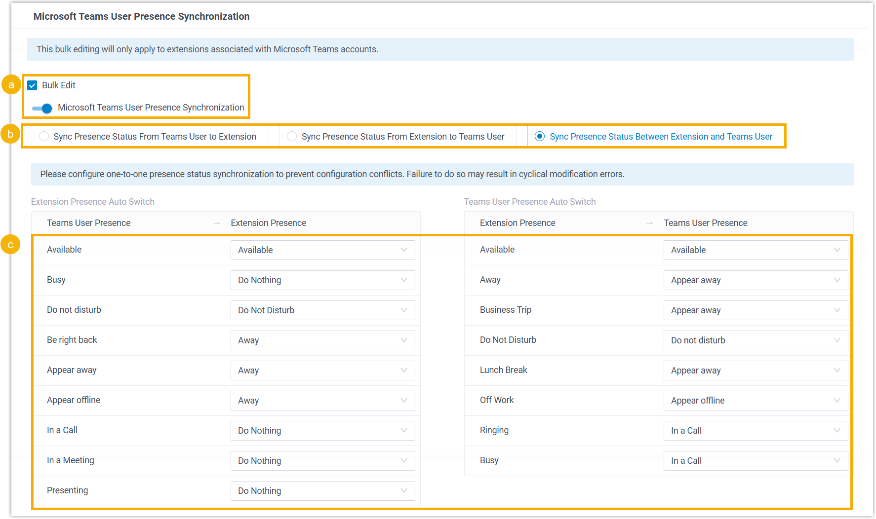 - If you enable bidirectional synchronization, when extension status is Ringing or Busy, the system will update the Teams user's presence accordingly, but it will NOT adjust the extension status based on the Teams' users presence.