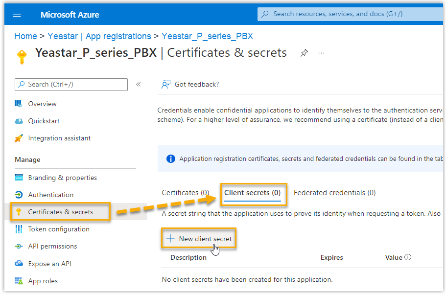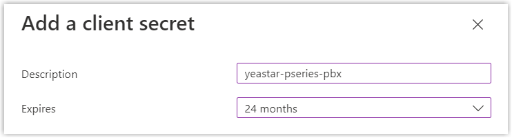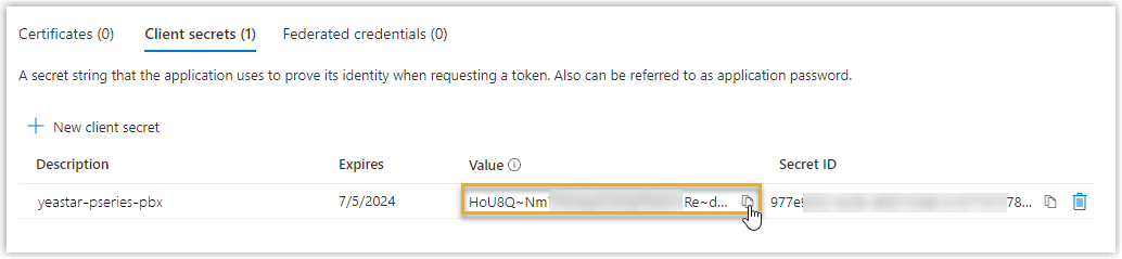 as you will need to fill it into the PBX later.Important: Record the client secret's value before leaving the page, as the key is only shown once. Otherwise, you will have to create a new secret.