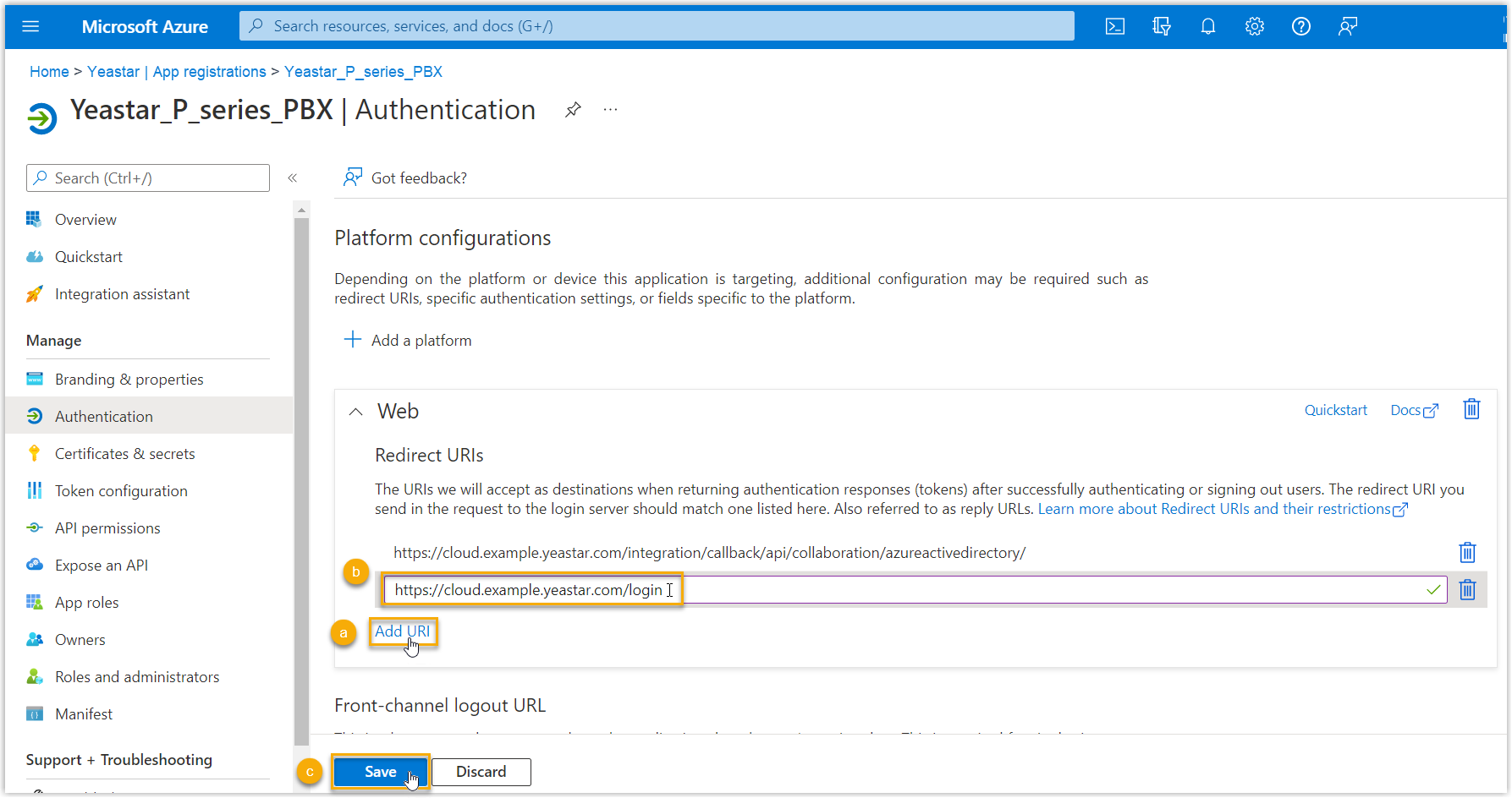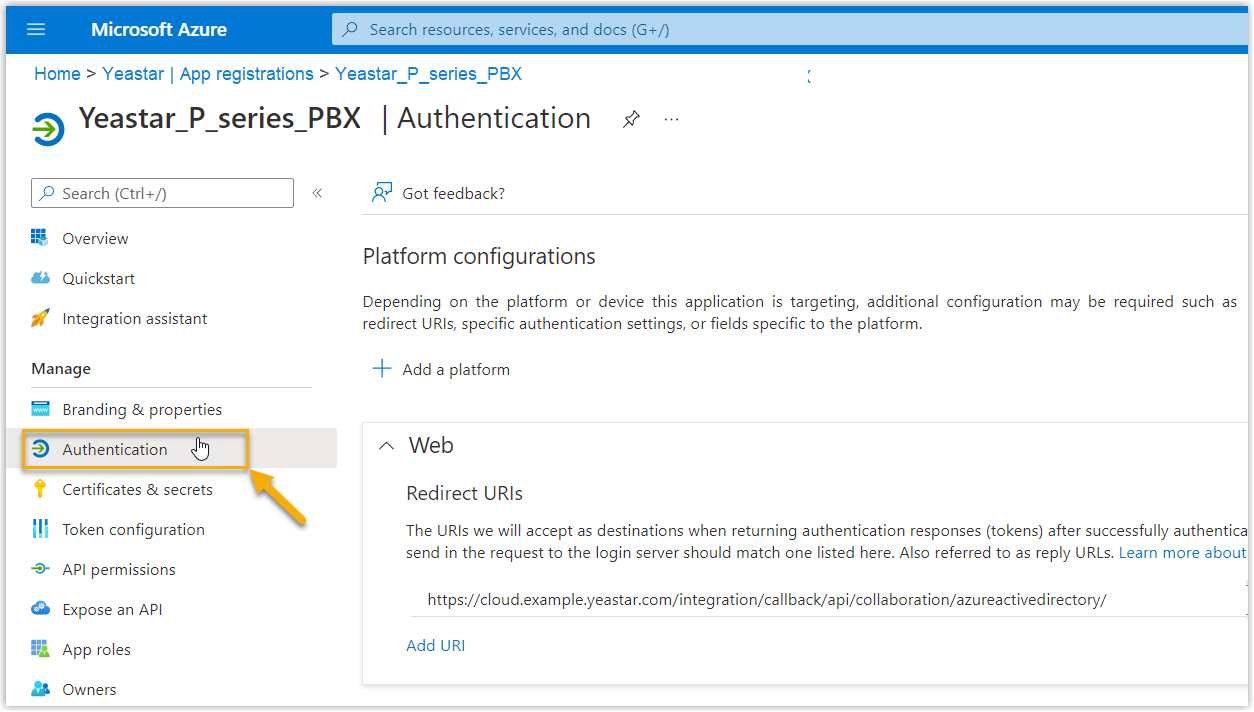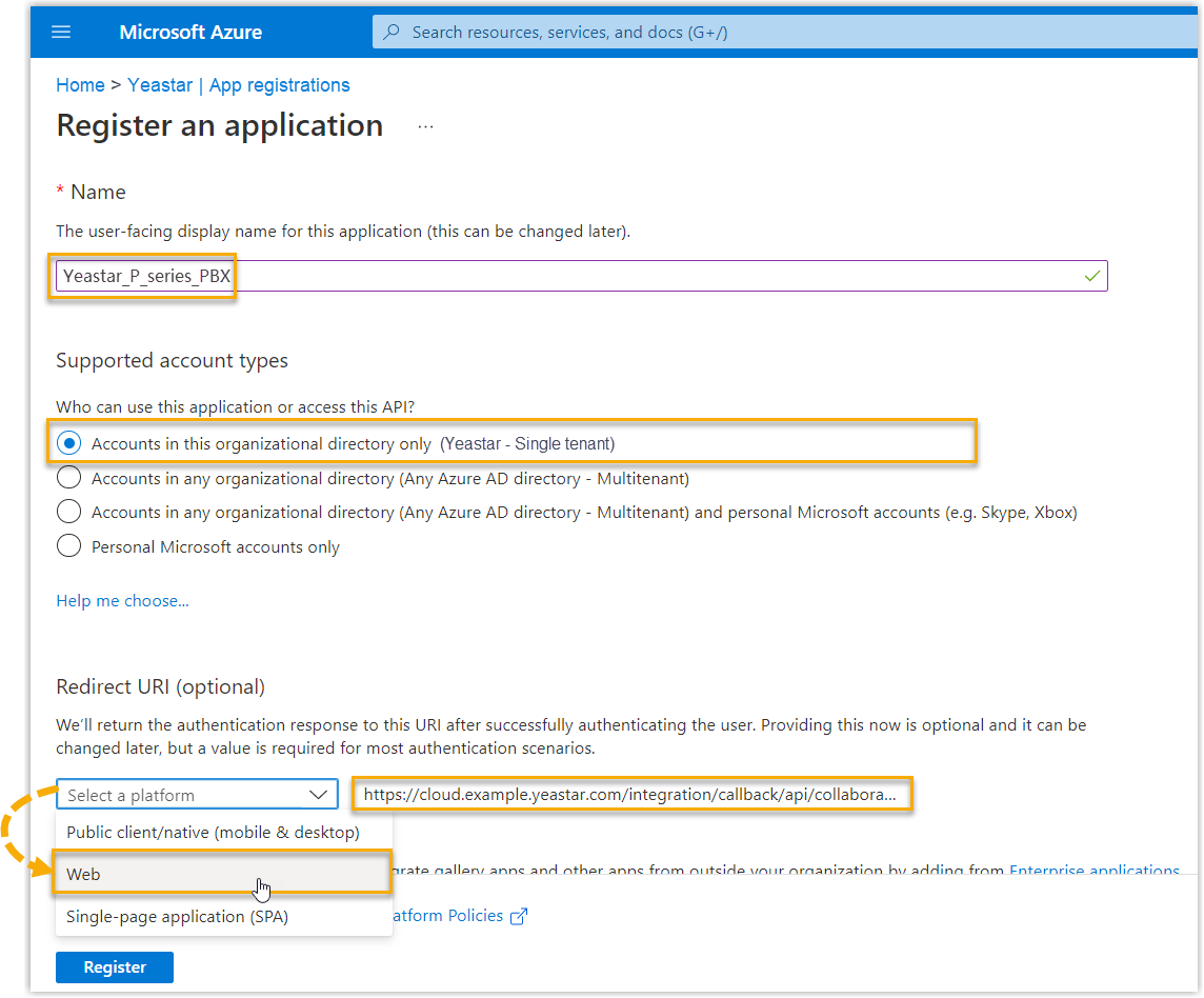 - Redirect URI: In the Select a platform drop-down list, select Web, then paste the Redirect URI obtained from the PBX.