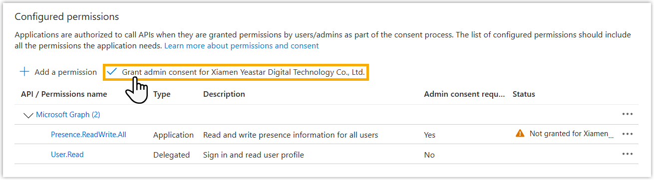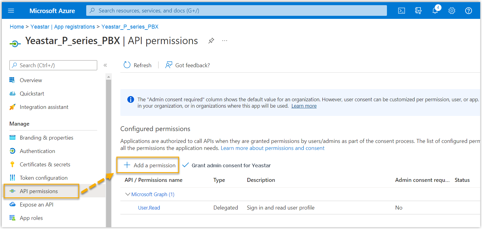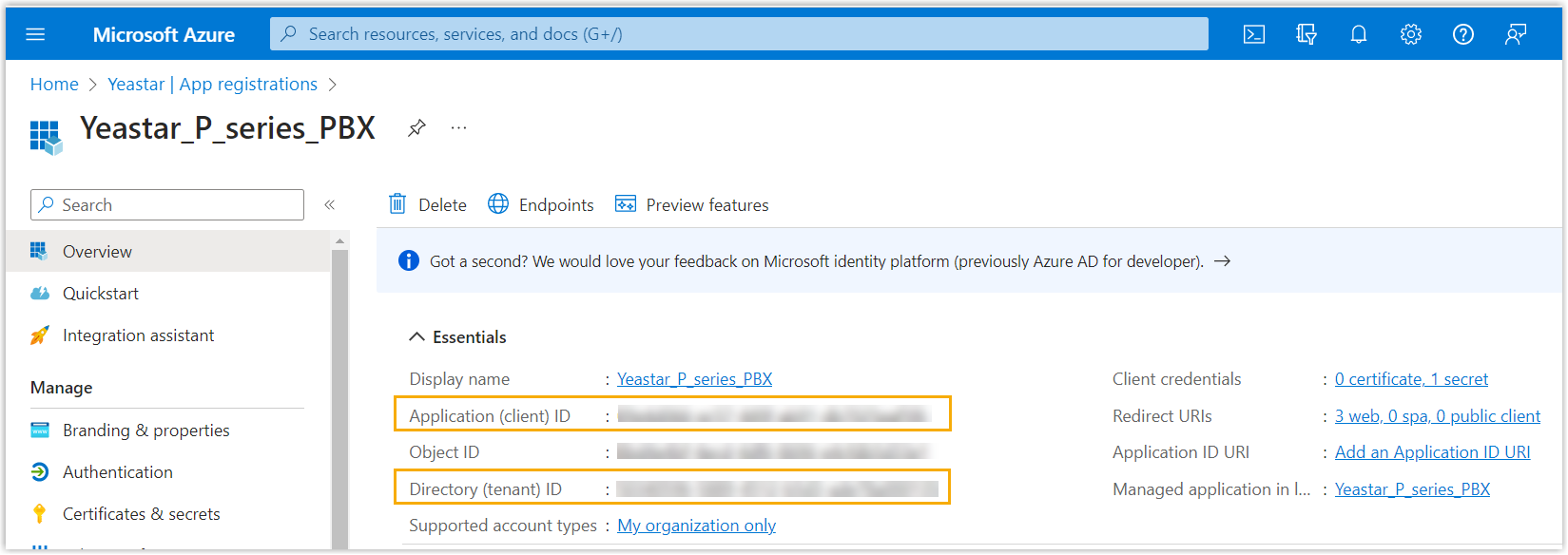 The Application (client) ID and Directory (tenant) ID of the application is displayed on the Overview page. Note them down as you will need to fill them into the PBX later.