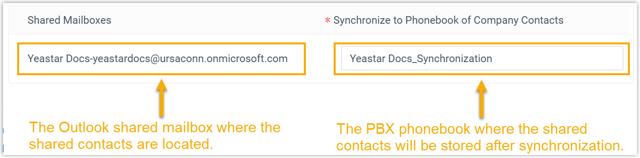 Option Description Contacts in All Shared Mailboxes Synchronize contacts from all the Outlook shared mailboxes to PBX phonebooks. Contacts in Specific Shared Mailboxes Synchronize contacts from specific Outlook shared mailbox(es) to PBX phonebooks. You can select the desired shared mailbox(es) in the Shared Mailboxes drop-down list.