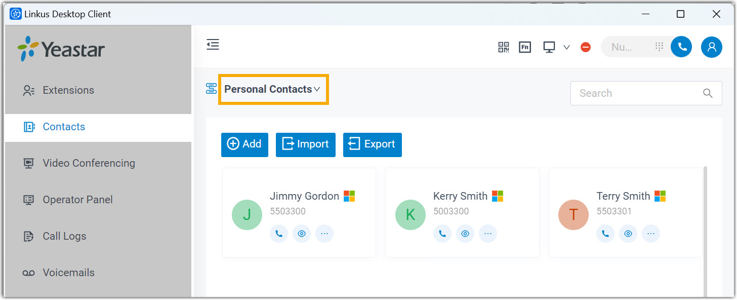 The shared mailboxes and their contacts are synchronized to PBX phonebook, which comes with a label