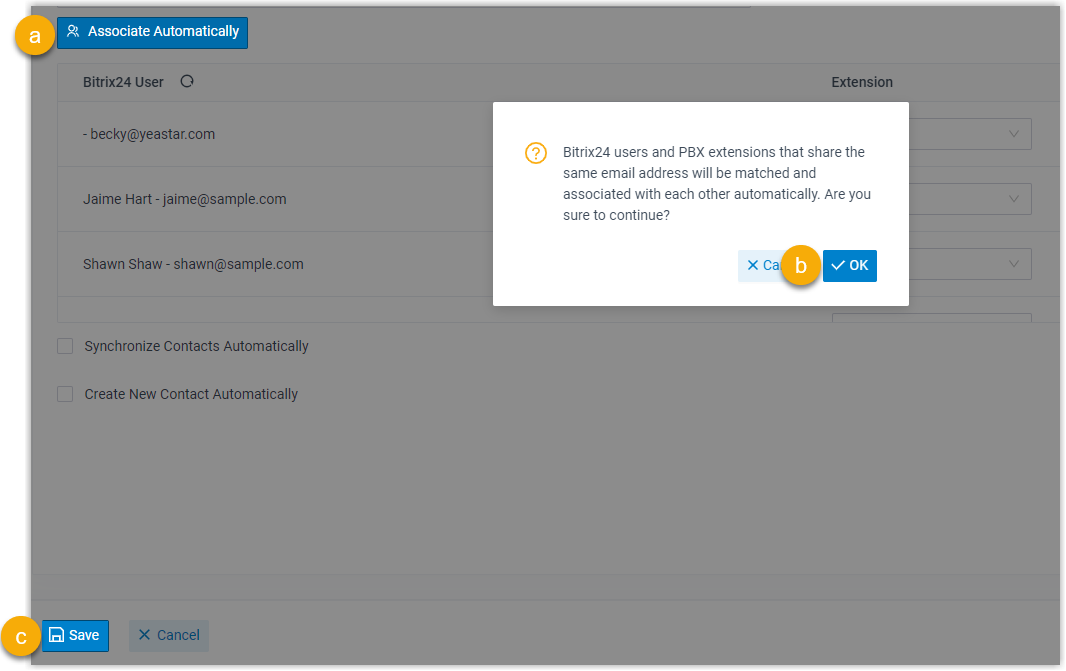 - If users bind the same email address to their Bitrix24 accounts and PBX extensions, you can implement automatic association of their Bitrix24 accounts and PBX extensions as follows: