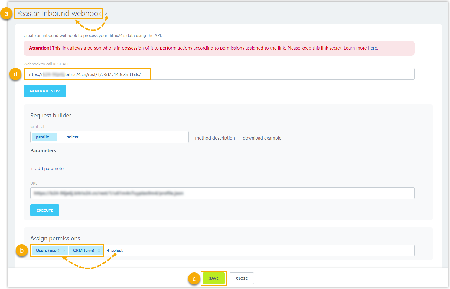 webhook. - In the Assign permissions section, click + select, then select Users (user) and CRM (crm).