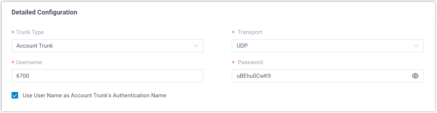 - Use User Name as Account Trunk's Authentication Name: Enable this option to use the trunk's username for authentication.