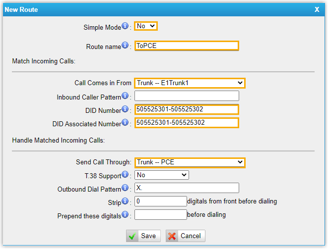 - DID Number: DID number will be used to match the incoming calls. DID number should be the same as DOD number on Cloud Voice PBX system. In this example, enter 505525301-505525302.