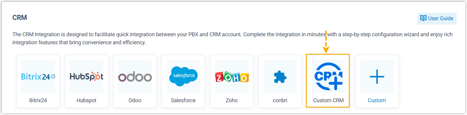 If your desired CRM is not in the list of ready-made integrations, you can implement a custom integration via a CRM integration template. This topic describes how to establish the integration.