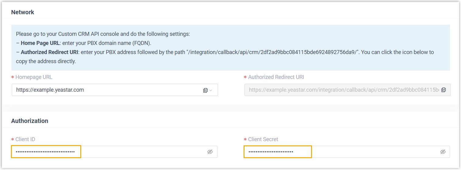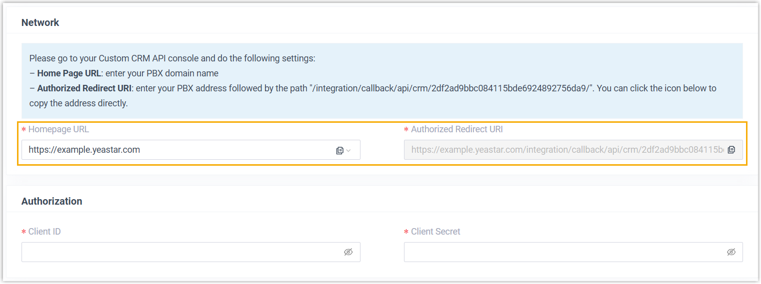 - In the Authorization section, enter the authorization information obtained from the application created in the CRM system.
