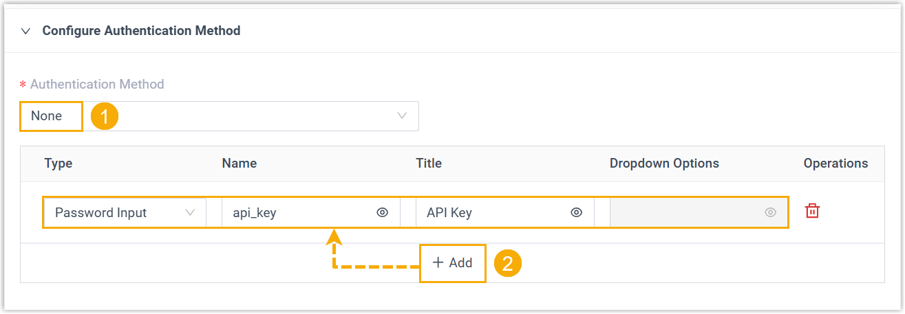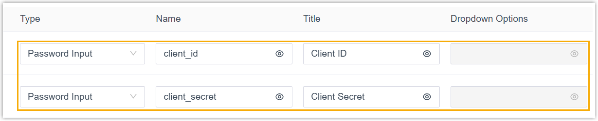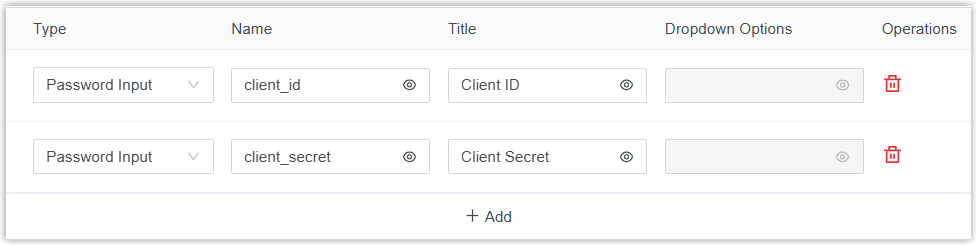 Name Specify the variable name for the field, which can be referenced within the template as needed. Title Specify the title for the field, which will be display above the input component. Dropdown Options If the Type is set to Dropdown List, enter the options in this field. Note: Use commas to separate multiple options. For example,option1,option2.