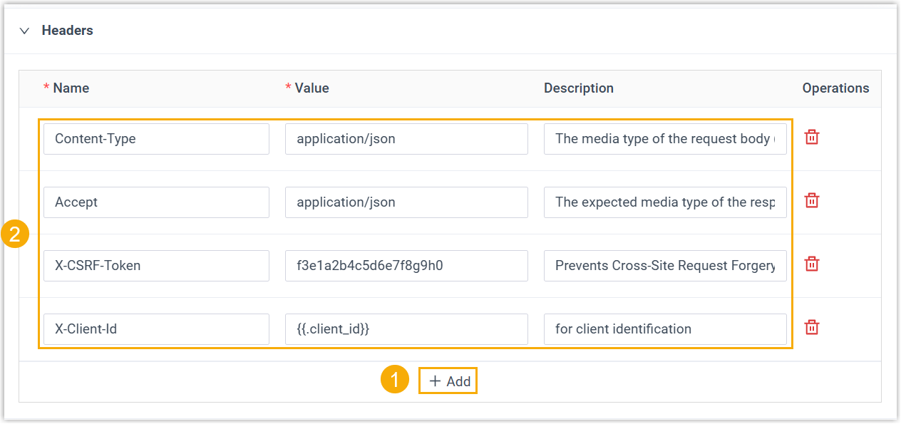 Setting Description Triggered Event Specify the pre-configured system event that triggers this request. Request Method Select the HTTP method for the API request. URL Enter the endpoint URL for the subsequent operation. For example,https://api.example.com/rest-services/loginHeaders Define HTTP headers of the request as a JSON object. You can use {{.varname}} to insert dynamic values. For example,