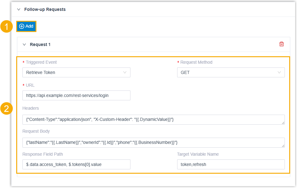 {"Content-Type":"application/json", "X-Custom-Header": "{{.DynamicValue}}"}Request Body Define the data payload of the request as a JSON object. You can use {{.varname}} to insert dynamic values. For example,{"lastName":"{{.LastName}}","ownerId":"{{.Id}}","phone":"{{.BusinessNumber}}"}Response Field Path Define the JSON path to extract data from the response of this follow-up request. Note: Use commas,to separate multiple variable names. For example,$.data.access_token, $.tokens[0].valueTarget Variable Name Define the name of the system variable to store the value extracted from the response. These can be existing variables or new custom variables. Note:- Use commas