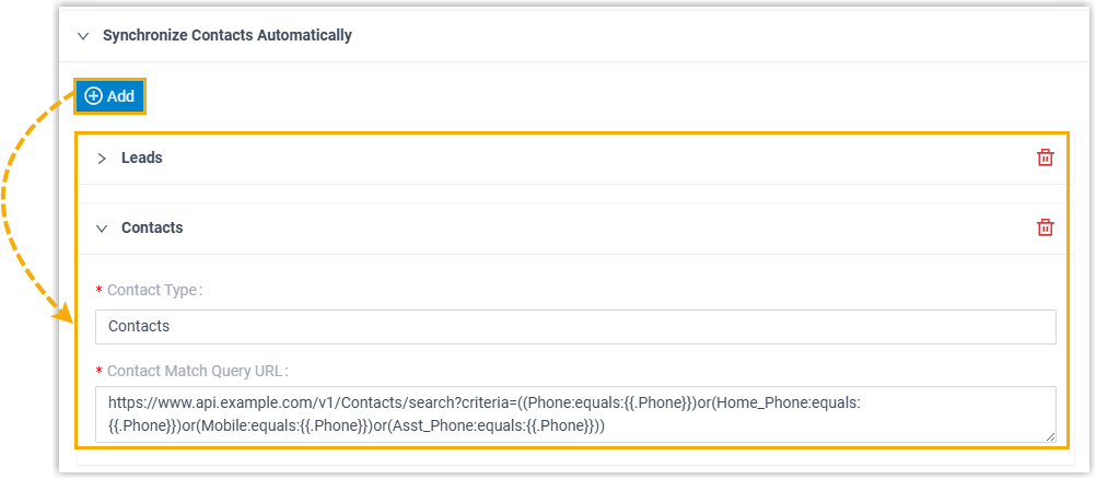 For example,https://www.api.example.com/v1/Contacts/search?criteria=((Phone:equals:{{.Phone}})or(Home_Phone:equals:{{.Phone}})or(Mobile:equals:{{.Phone}})or(Asst_Phone:equals:{{.Phone}}))