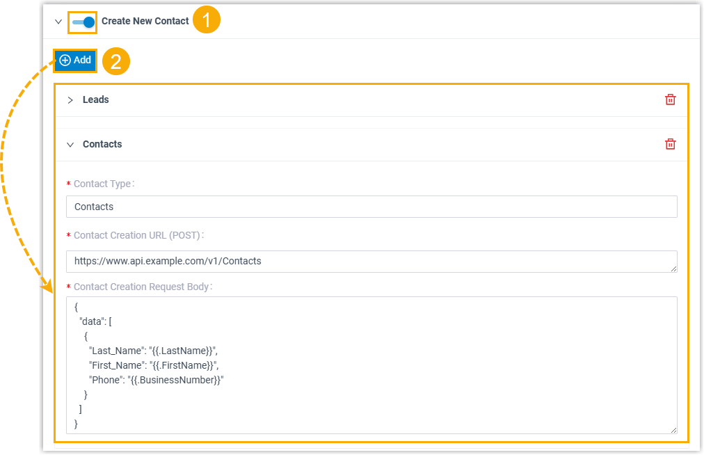 https://www.api.example.com/v1/Contacts - Contact Creation Request Body: Enter the