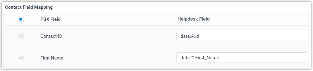Helpdesk fields to the required PBX fields by specifying the JSON path (e.g.