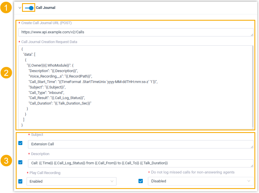 Description If enabled, the corresponding setting will be available to configure in the integration. This can be used to specify the details of the synchronized call logs. For example,Call: {{.Time}} {{.Call_Log_Status}} from {{.Call_From}} to {{.Call_To}} {{.Talk_Duration}}Note:- The values set in these fields will also be captured as variable values if necessary.