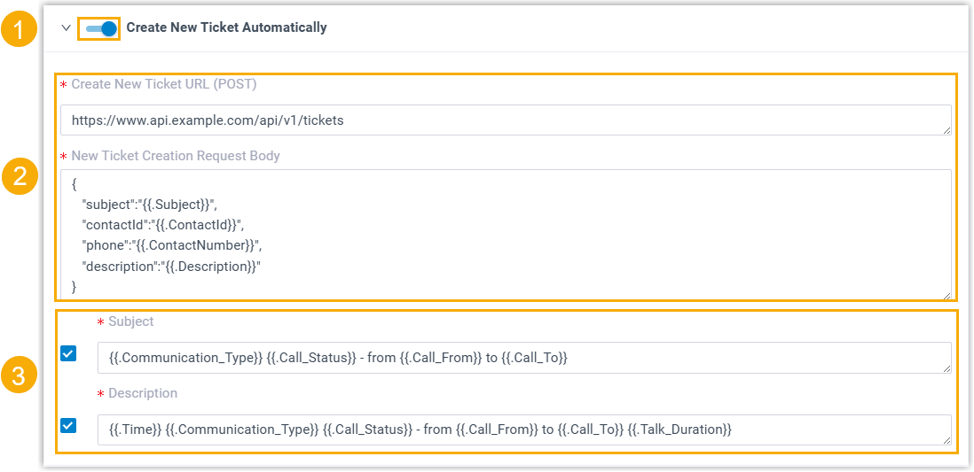 { "subject":"{{.Subject}}", "contactId":"{{.ContactId}}", "phone":"{{.ContactNumber}}", "description":"{{.Description}}" }
