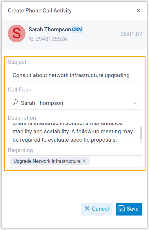 This topic describes how to add or update phone call activity details during an active call, ensuring that all call-related information is properly logged for future reference.
