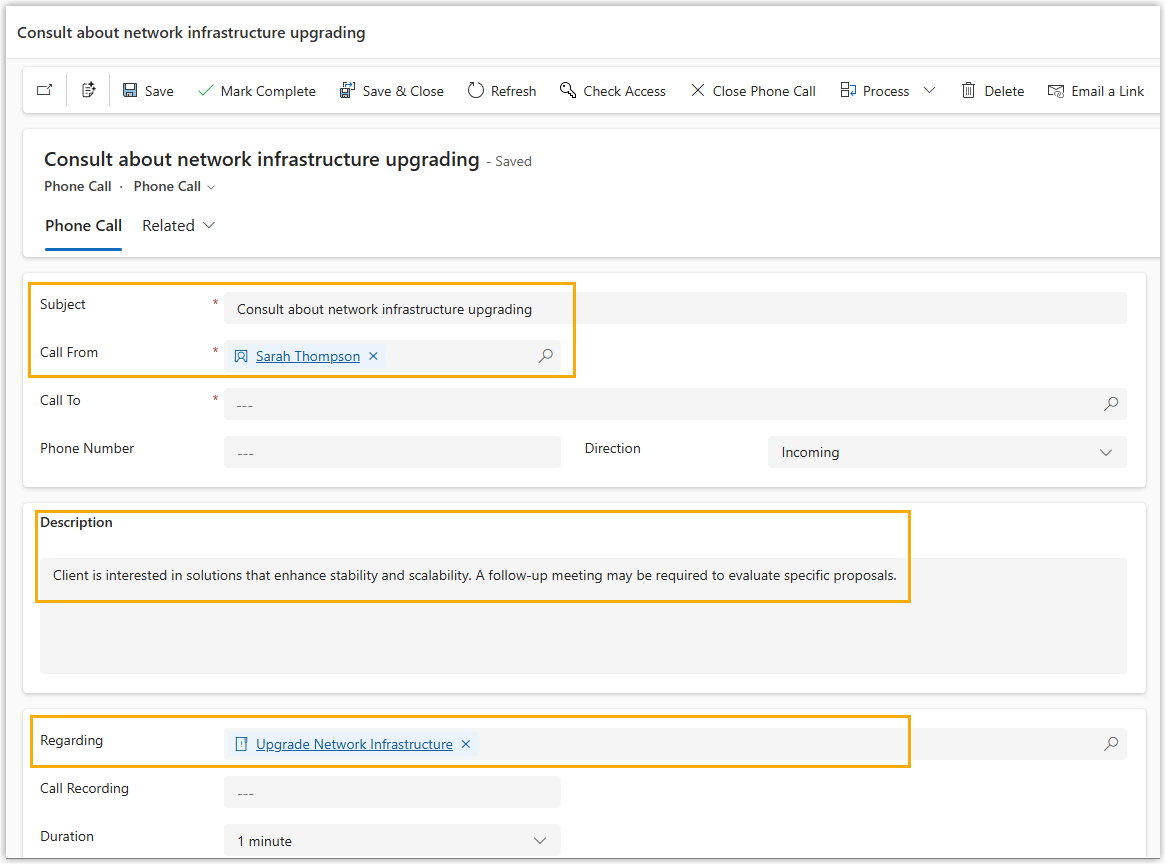 The phone call activity is updated to Dynamics 365 and associated with the specified contact and record.