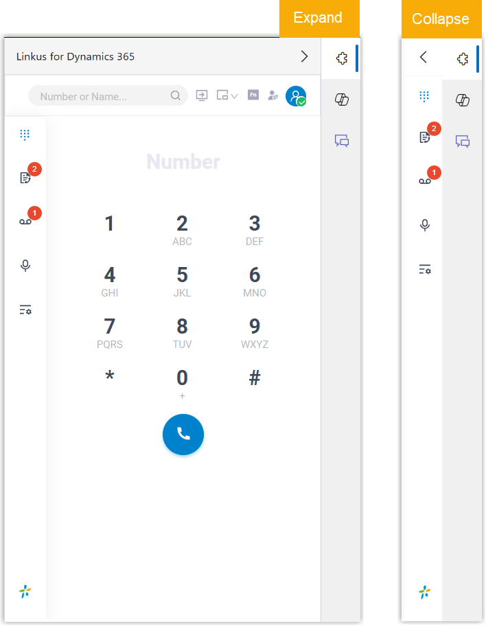After you log in to your extension in the plugin within Dynamics 365, a mini Cloud Voice App client is displayed. The layout of the plugin is as shown below: