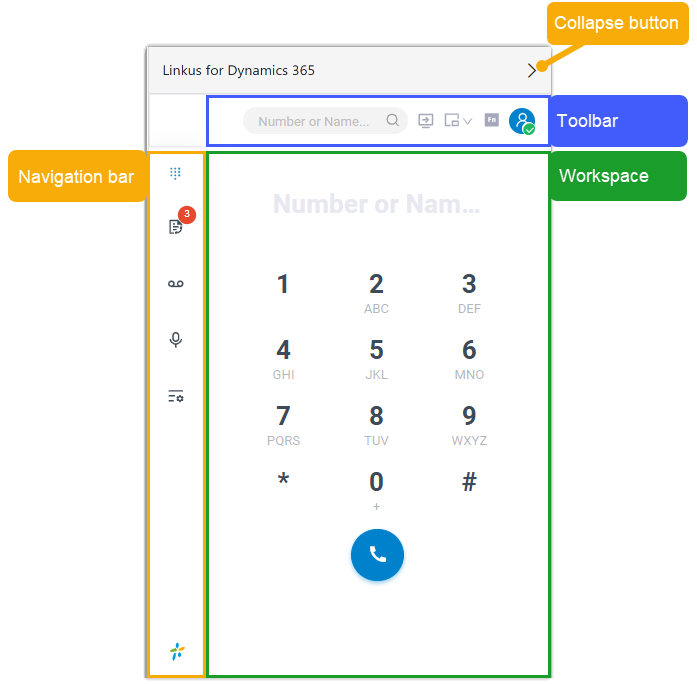 The 'Cloud Voice App for Dynamics 365' plugin provides a simplified Cloud Voice App interface for easy access to calling features within Dynamics 365. This topic provides an overview on the plugin interface and detailed descriptions of each component.