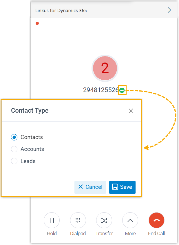 - If automatic creation is enabled, when a call from an unknown number is received, or a call is placed to an unknown number, the number will be added as the specified type of contact in Dynamics 365 CRM.