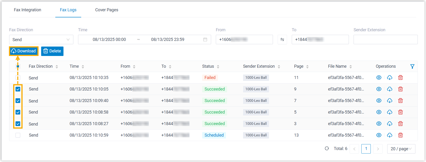 Item Description Fax Direction Select Send or Receive to filter sent or received faxes. Time Specify a time range to filter faxes sent or received within the period. From Enter the sender's fax number in E.164 format. To Enter the recipient's fax number in E.164 format. Note: For scheduled outbound faxes with multiple recipients, only the first number displayed in the list will be searched.Sender Extension Enter extension number or extension name to filter faxes sent by a specific user. - Select the checkboxes of the fax logs that you want to download, then click