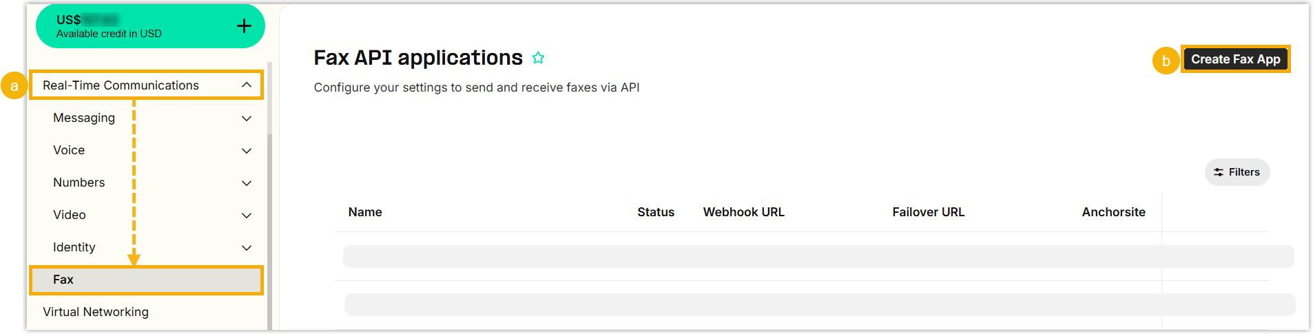 - At the top-right corner, click Create Fax App.