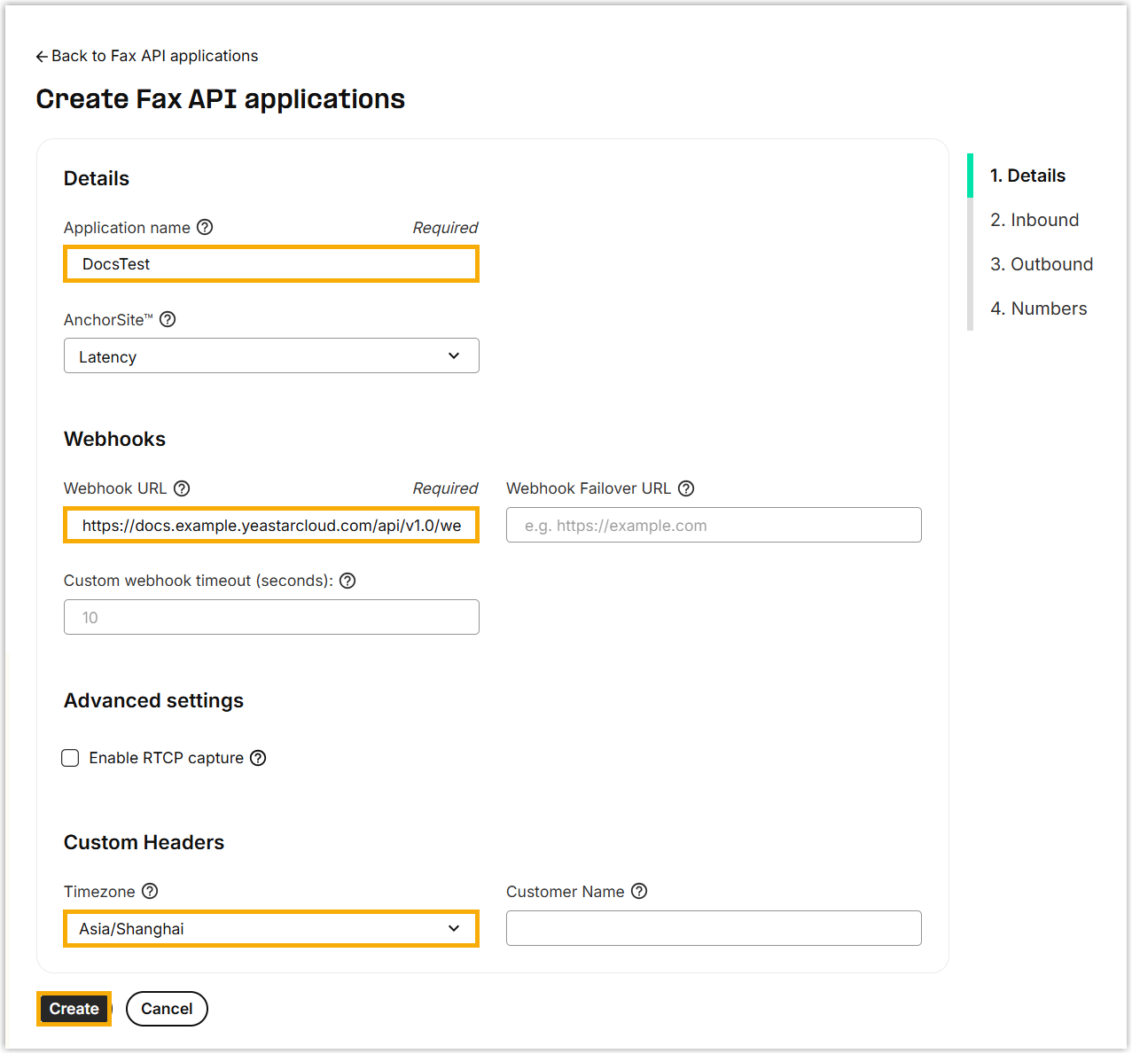 Setting Description Application name Enter a name to help you identify the application. Webhook URL Paste the Webhook URL obtained from Cloud Voice PBX. Timezone Specify the time zone used in the fax header timestamps.