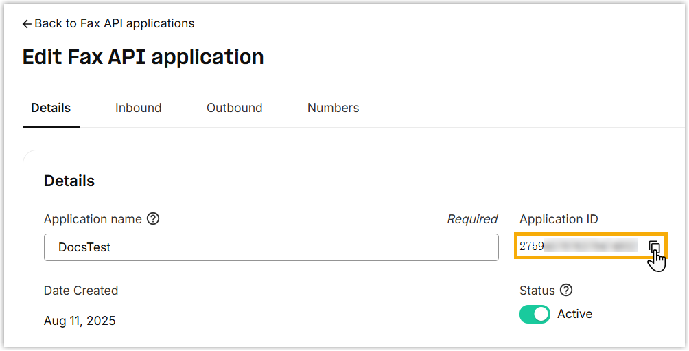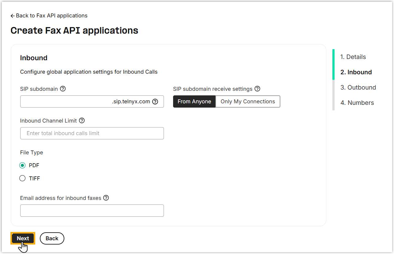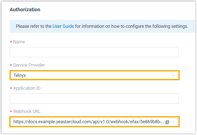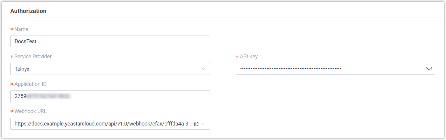 Setting Description Name Enter a name to help you identify the integration. Service Provider Select Telnyx. API Key Paste the API key obtained from Telnyx. Application ID Paste the application ID obtained from Telnyx. - Optional: To forward inbound faxes as email