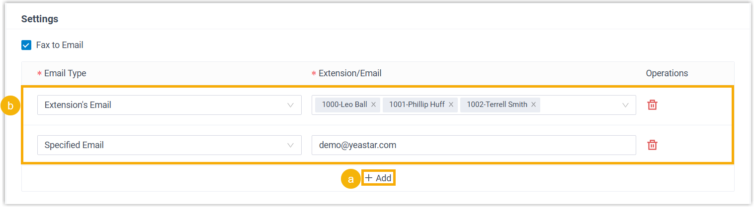 Setting Description Fax Number Enter the fax number in E.164 format. Example: +12498037994Important: Remove hyphens-from the fax number, otherwise the fax delivery will fail.Fax Reception Destination Select extensions or extension groups that can receive inbound faxes. The designated users can view inbound faxes from Cloud Voice App Desktop or Web Client (Path: ).
