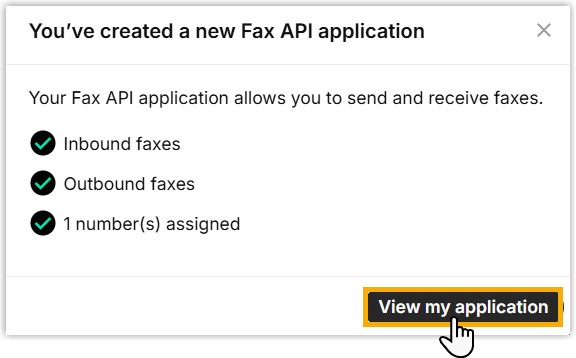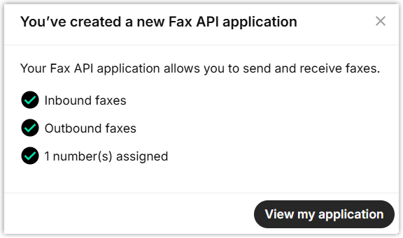 A window pops up, indicating that the fax application is created.