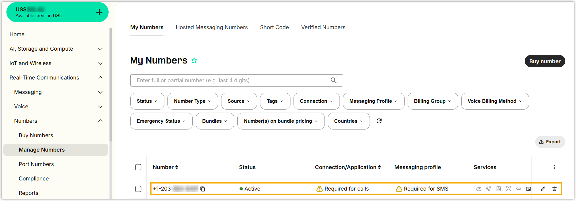You will be redirected to the Manage Numbers page, where the purchased number is displayed.