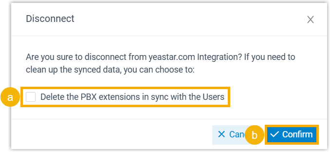 - If you want to delete the PBX extensions associated with the synced users, select the checkbox of Delete the PBX extensions in sync with the Users.